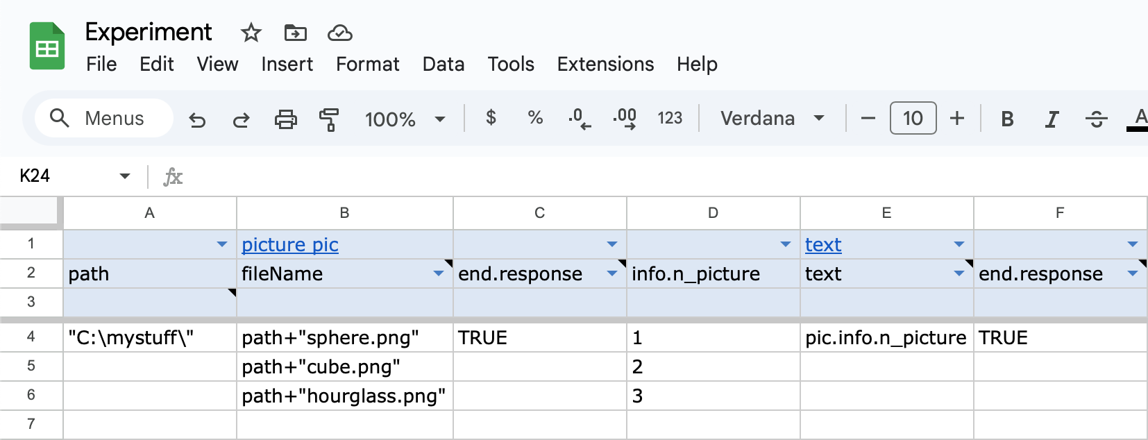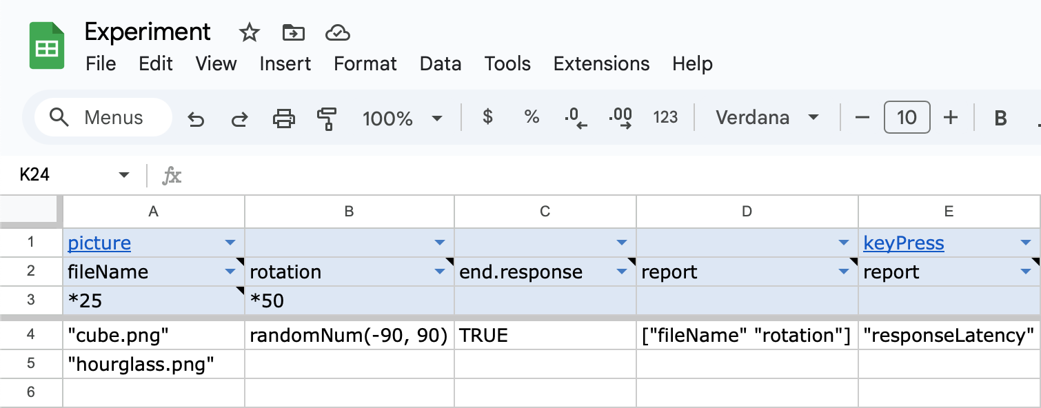 The main part of making an experiment is making its trial definitions. For each trial this just means setting property values for all the element objects to run in it. You can also set trial object properties if you want to change any away from default (e.g. preTrialInterval). To make trial definitions, use a table in your spreadsheet file with columns = object properties and rows = trial definitions. You can also use more than one sheet/table if convenient.
